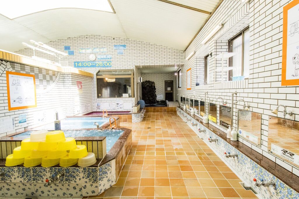 番台形式の受付やタイル張りの浴室など、京都の銭湯文化を感じられる空間です。