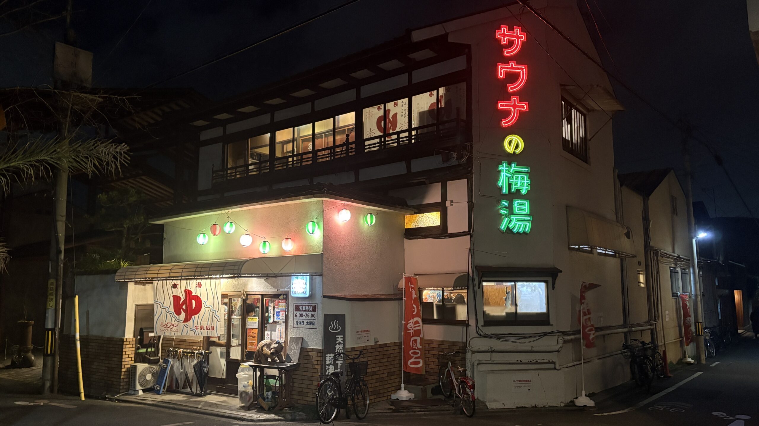 近づくと見えてくるネオン看板が目に入ると、「梅湯に来たな」と感じる独特の空気感があります。